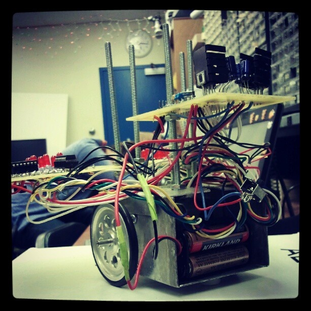 For this project, I was the lead programmer who was responsible for programming the various capabilities of the mouse. I started by programming the basics, such as sensor polling and motor actuation using interrupts. From there, I then programmed the basic PD controls for the motors of the mouse. The PD control the drive so that the mouse would stay centered while traversing the maze and keep the mouse driving straight. I also programmed basic algorithms used to solve the maze such as a right wall hugger and a left wall hugger algorithm. From there I worked on a flood-fill algorithm to help the mouse track where it is in the maze, and to map the route it takes. We finished with the fastest mouse who finished the maze within our college.
